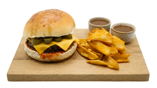 Dinlenmiş et,cheddar peyniri, harvey acı sos ve jalapeno biber